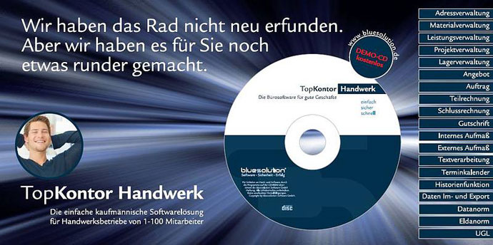 blue:solution software ist Hersteller für kaufmännische Software im Baunebengewerbe. 1600 Handwerksbetriebe haben sich in den letzten 2 Jahren für TopKontor von blue:solution entschieden und damit zu einem führenden Anbieter für Handwerker gemacht.